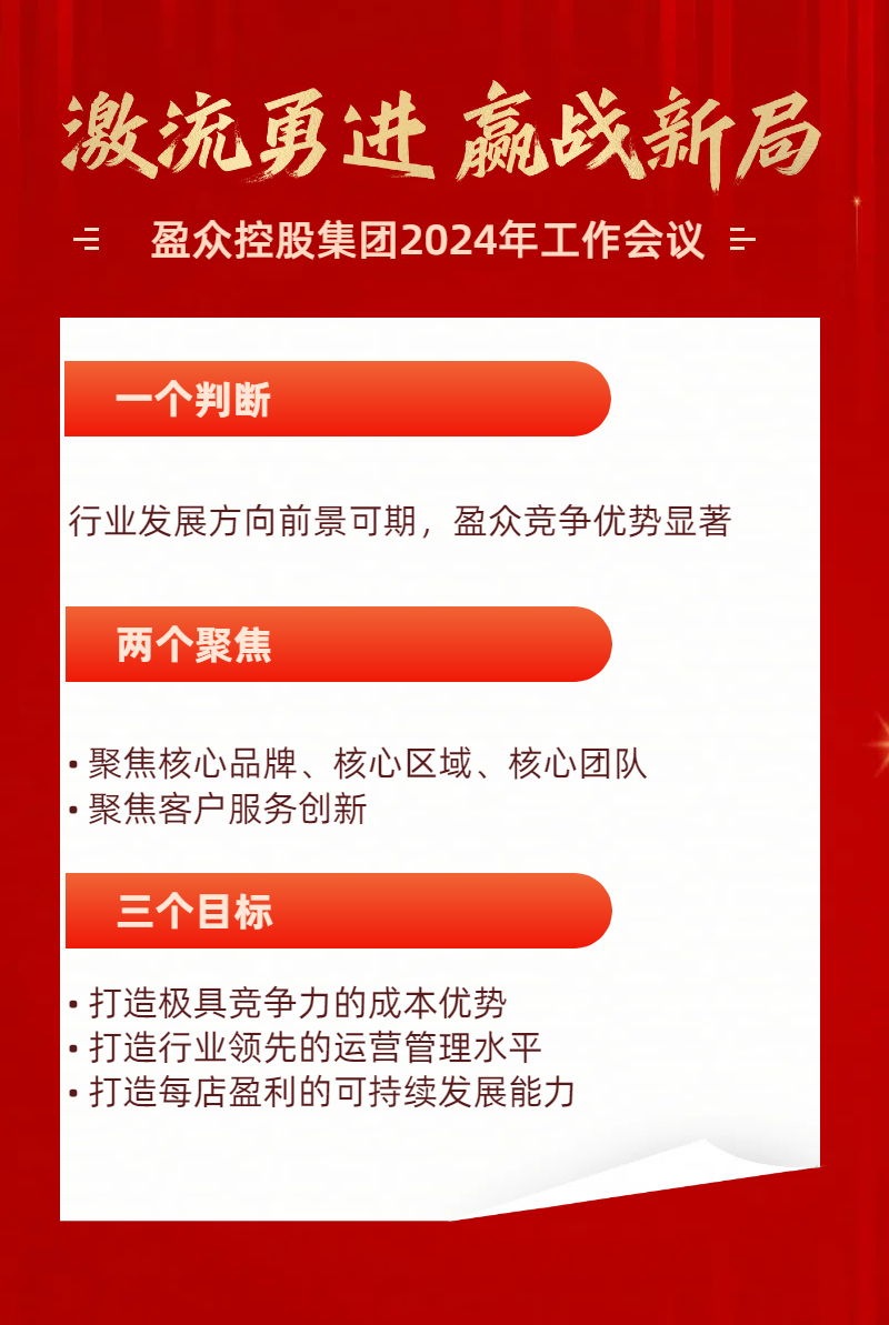 報(bào)告最后,易總對(duì)全體干部提出了要求與期望,希望大家于盈眾同舟共濟(jì),顧全大局;于團(tuán)隊(duì)身先士卒,敢打勝仗;于自己廉潔奉公,守正創(chuàng)新;于過程全情投入,全程緊盯;于結(jié)果勇于擔(dān)責(zé),言出必踐。“2024年注定是延續(xù)巨大挑戰(zhàn)的一年,望全體同仁,不畏萬里關(guān)山,在激流中奮勇前進(jìn),贏取勝利新局面。”